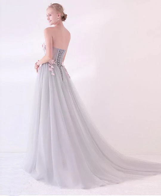 Grey Long Applique Tulle Evening Dresses Sweetheart Formal Prom Dress OK874