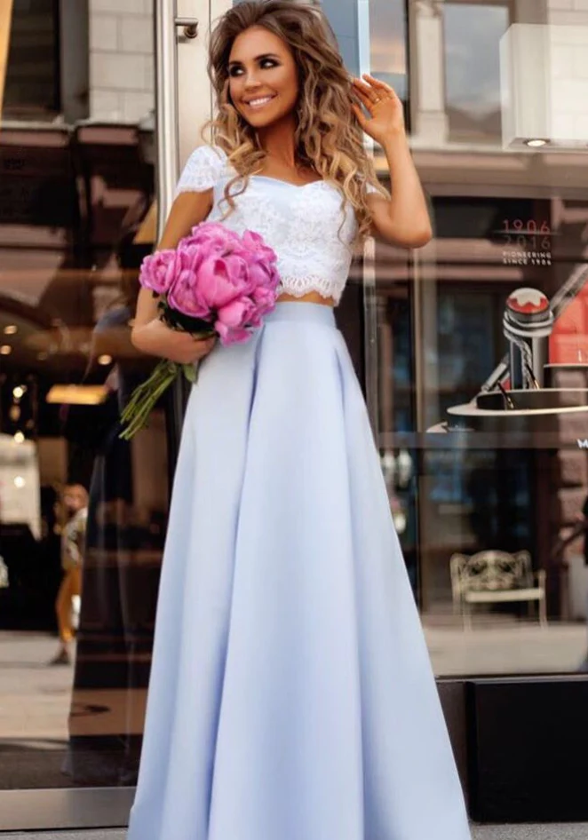 Cheap Light Blue Satin Two Piece Lace Top Floor Length Prom Dresses OK891