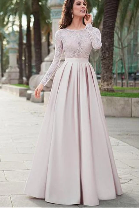 Lace Top Satin Jewel Neckline Long Sleeves A-line Prom Dresses Evening Dress OK890