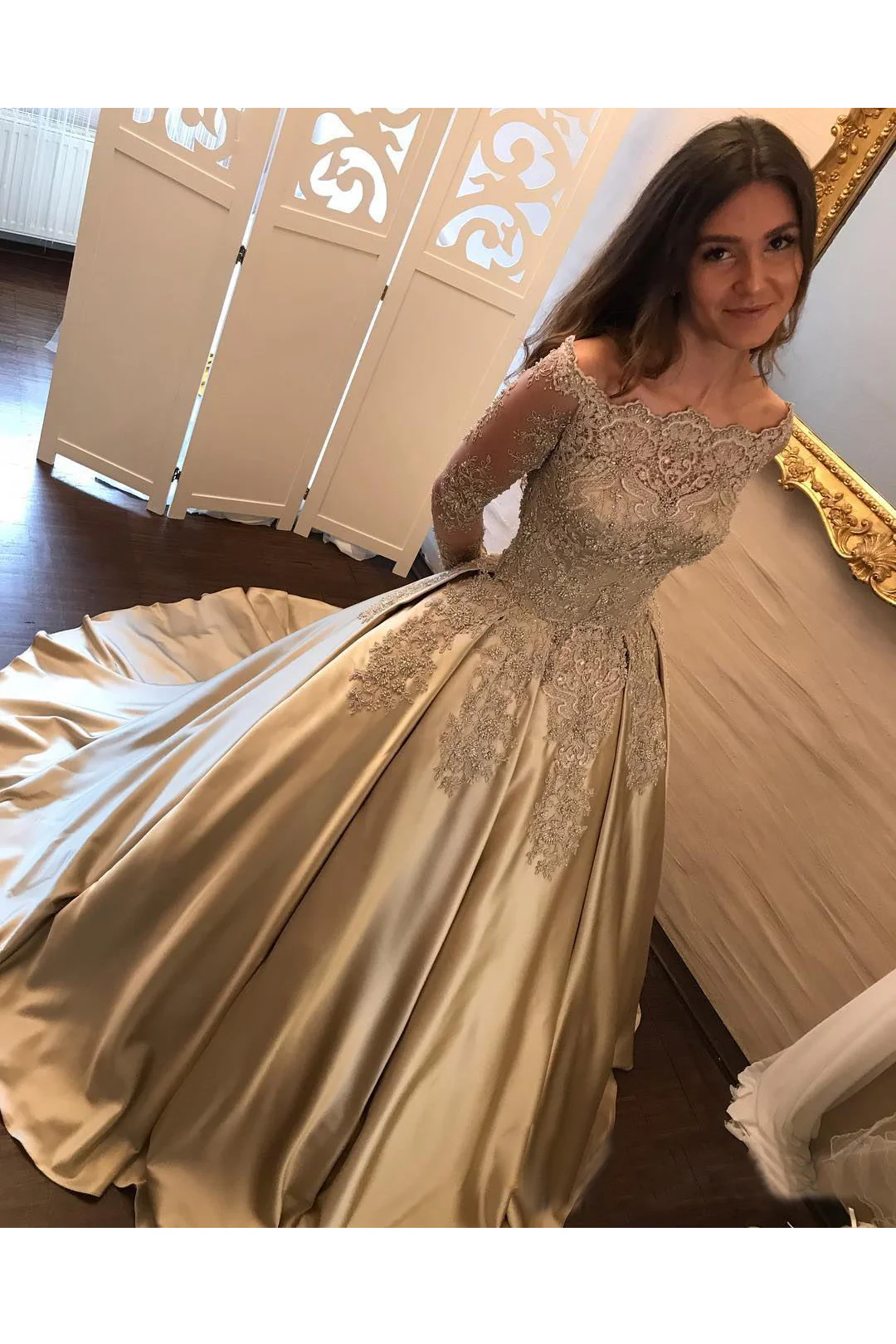 Charming Satin Ball Gown Long Sleeve Lace Appliques Prom Dresses OK853