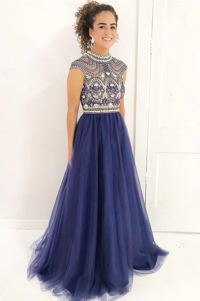 Stylish A Line High Neck Cap Sleeves Beaded Tulle Prom Dresses,Formal Evening Dress OK826