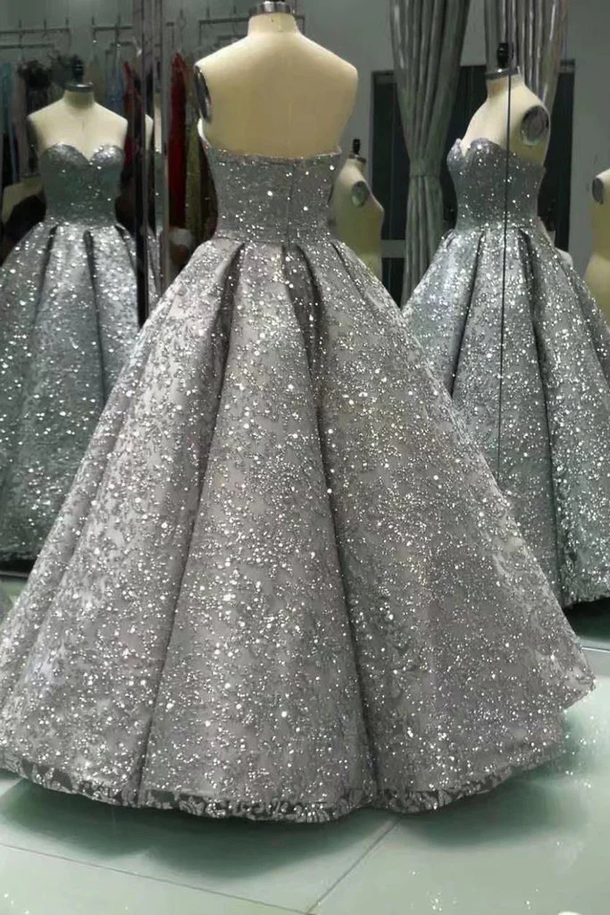 Sweetheart Gray Sleeveless Long Ball Gowns Shiny Sequin Prom Dresses OK841