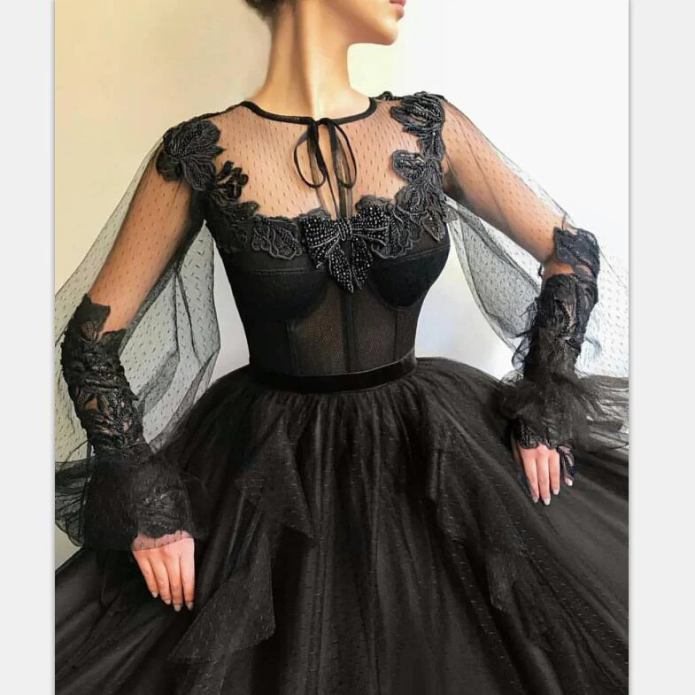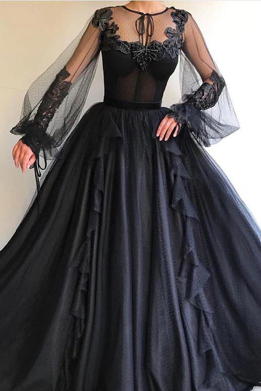Black Long A-line Tulle Prom Dresses, Long Sleeves Modest Evening Gown OKG82