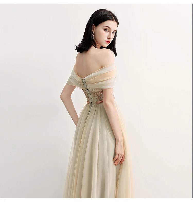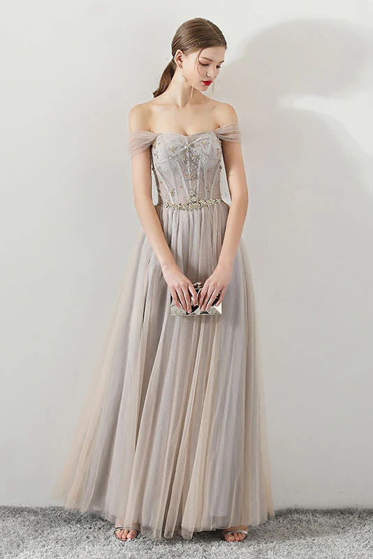 Charming Off the Shoulder A Line Tulle Long Prom Dress With Beading OKG70