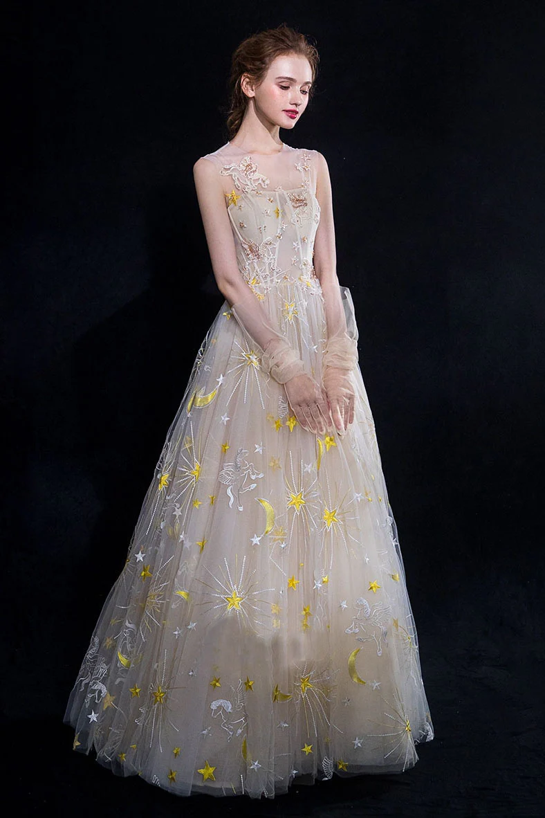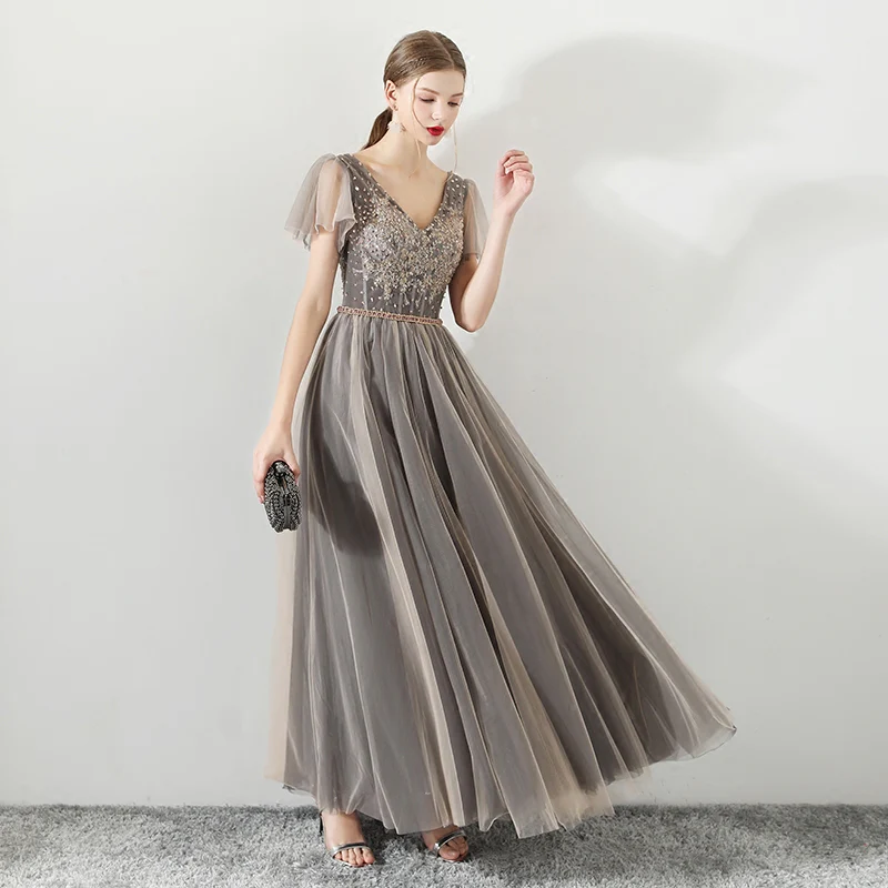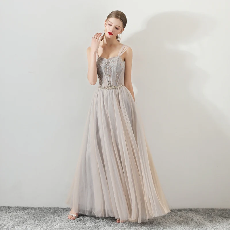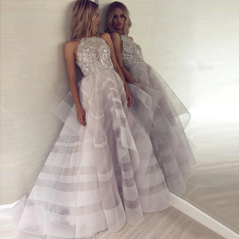 A Line Tulle Long Appliques Beaded Prom Dress, Grey Formal Evening Dress OKG72