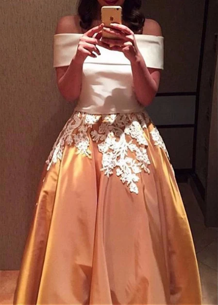 A Line Off the Shoulder Lace Appliques Two Pieces Cheap Prom Dresses OKG11