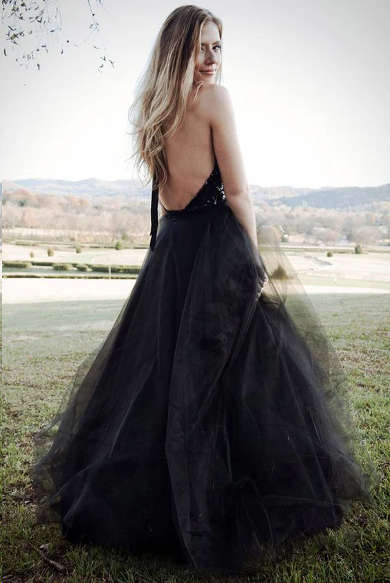 Black Tulle Backless Halter A Line Cheap Long Prom Dress Sexy Evening Dresses OKG27