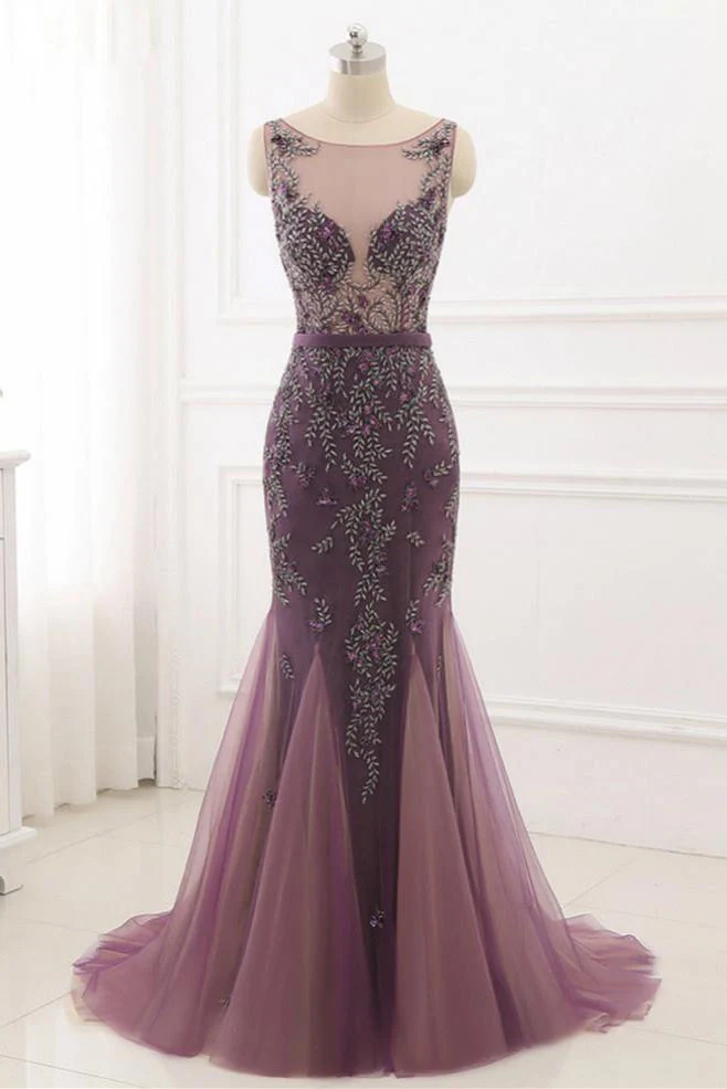 Beading Scoop Mermaid Sweep Train Tulle Long Cheap Prom Dresses OKG25