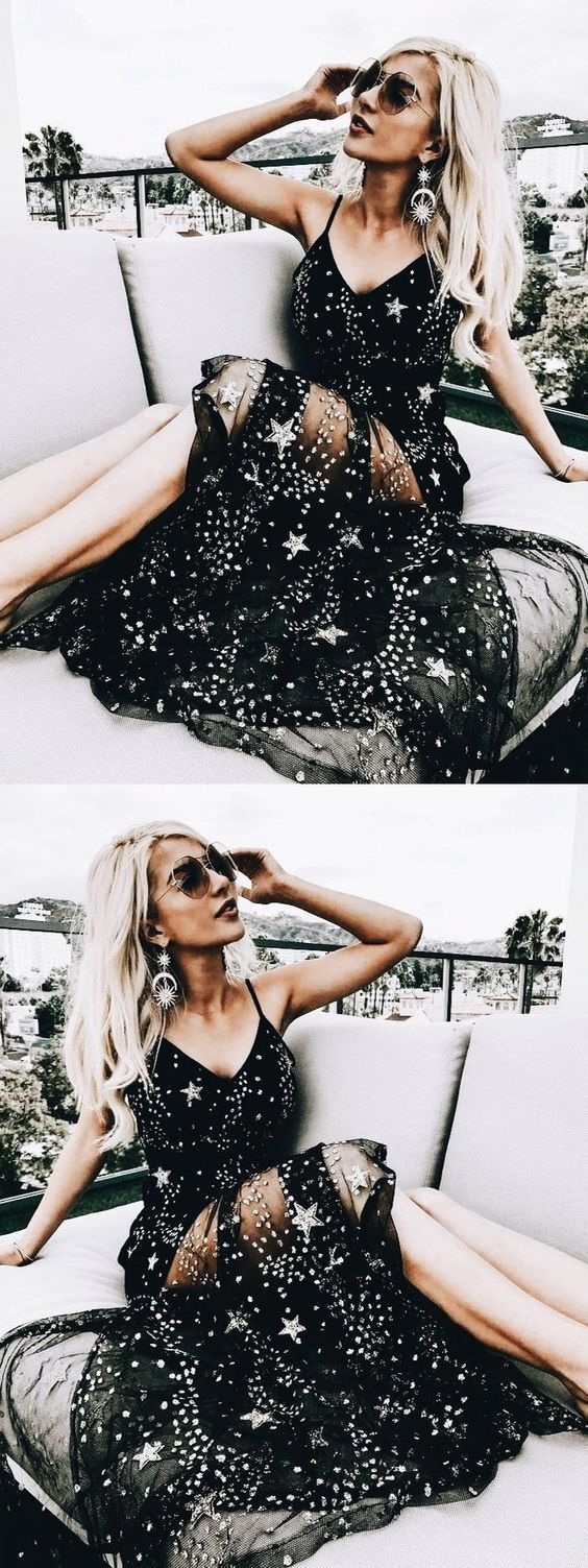 Sexy Sparkly Black Spaghetti Straps A Line Star Long Prom Dresses OKG9