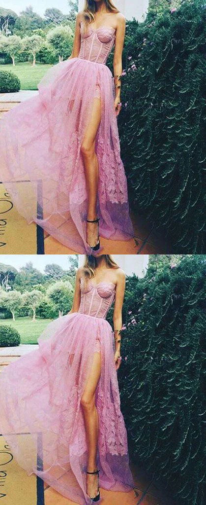 Sexy Pink Sweetheart Side Split Lace Appliques Pretty Long Prom Party Dresses OKG13