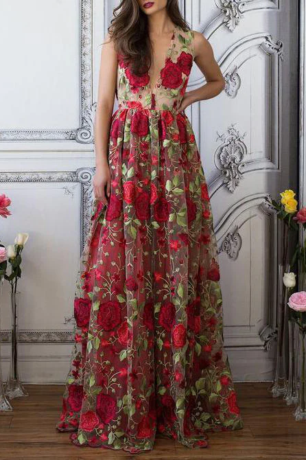 Red Floral Embroidery See Through Long Elegant Formal Prom Dress OKG89
