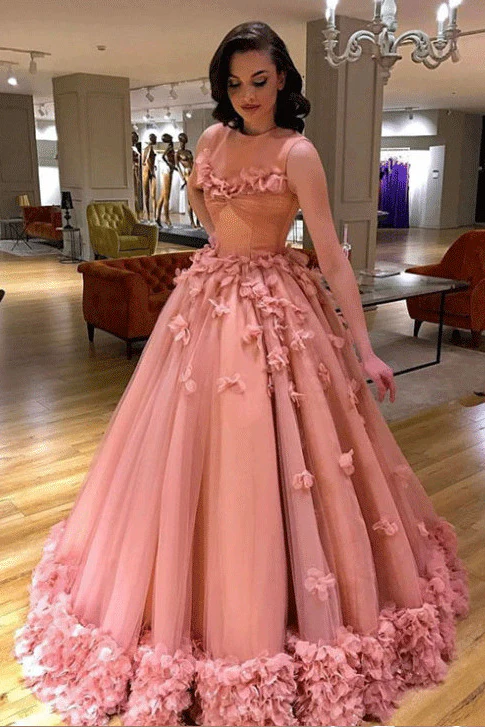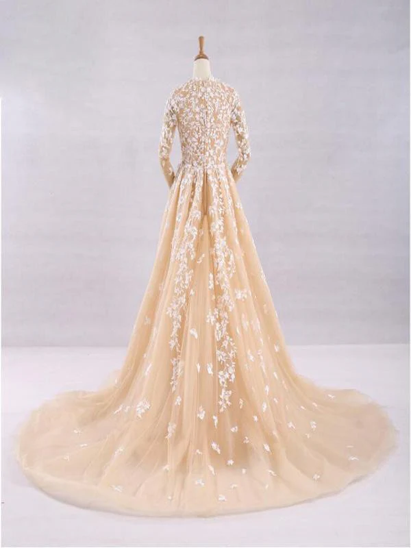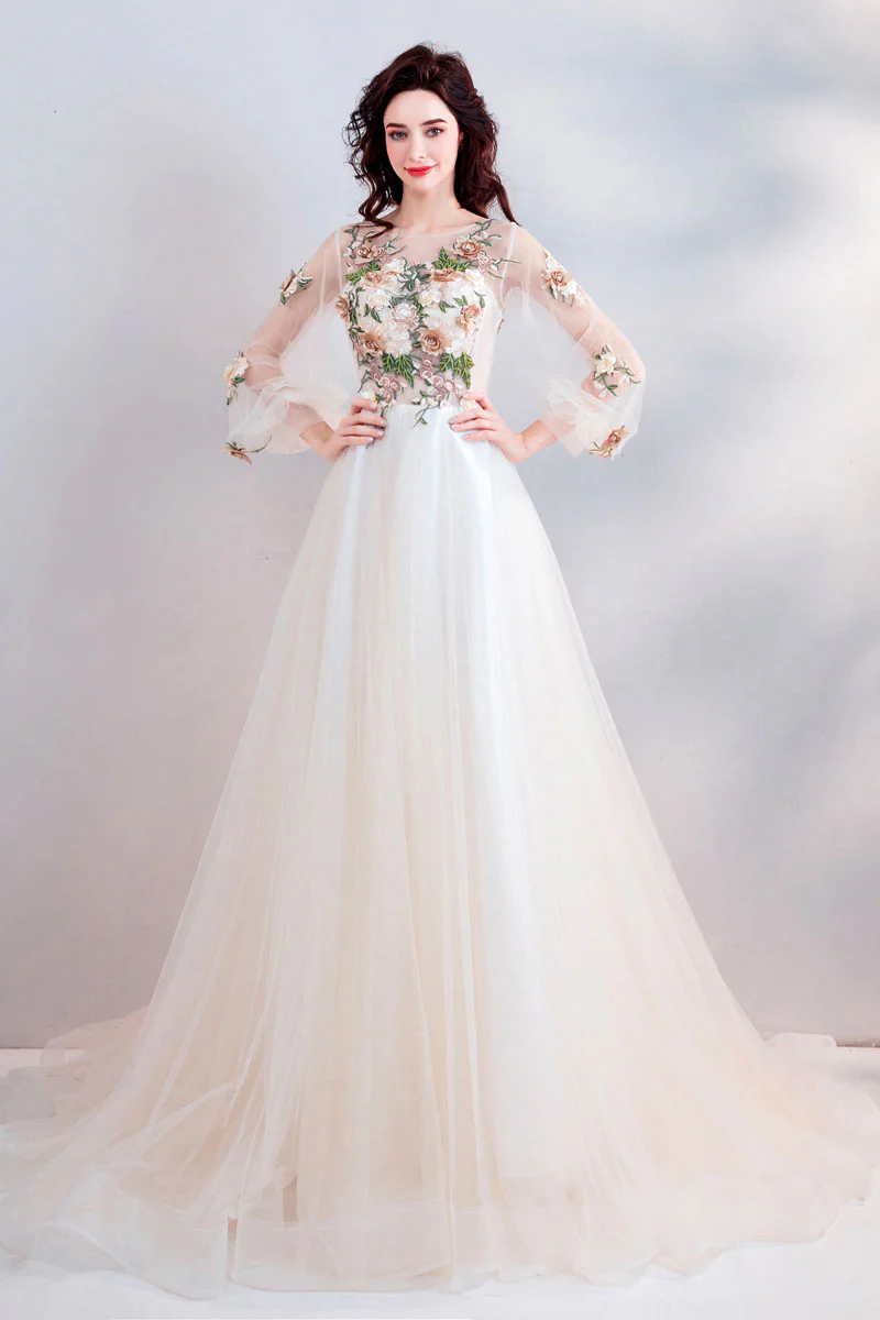Pretty A Line Long Sleeves Tulle Appliques Prom Dress With Flowers OKG69