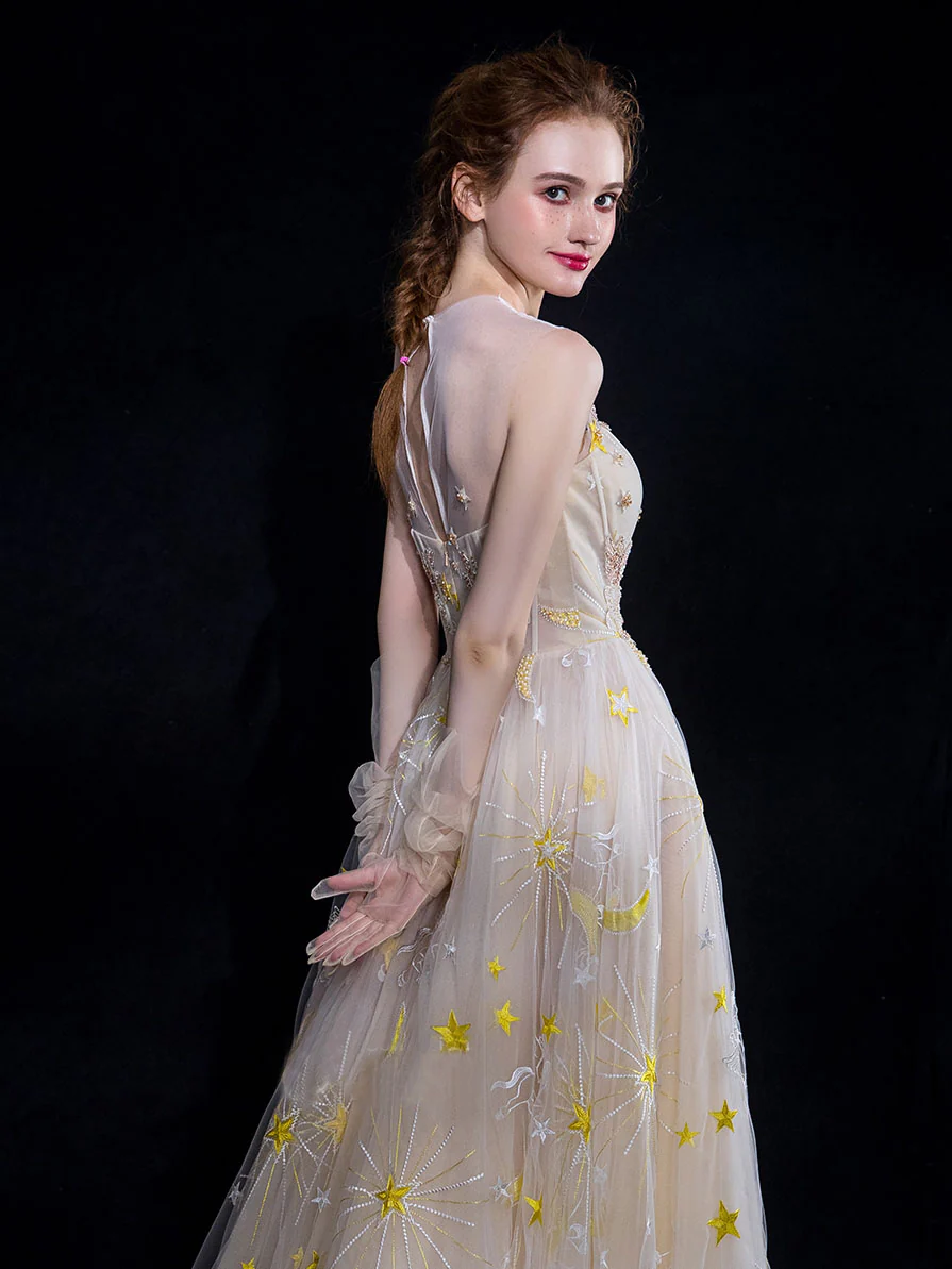 A Line Tulle Long Straps Lace Up Back Beaded Prom Dress,Evening Dress OKG73