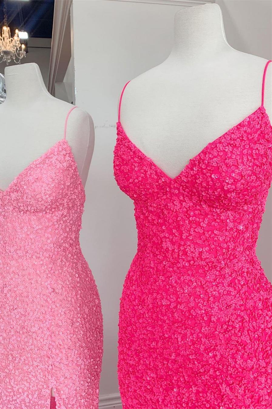 Hot Pink Sequins Mermaid Long Prom Dress With Slit Evening Party Dress OK1300