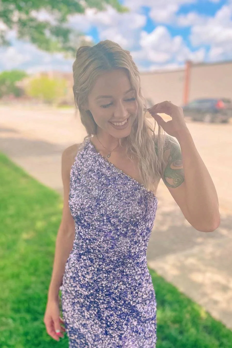 Stunning One Shoulder Lavender Sequins Long Prom Dress With Slit OK1326