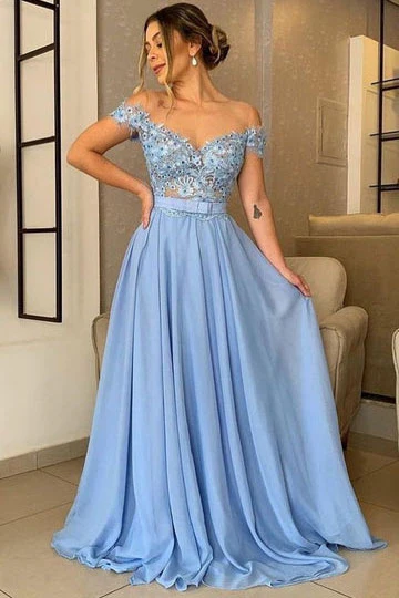 Off the Shoulder A Line Chiffon Blue Long Prom Sresses Appliques Evening Dress OK1330