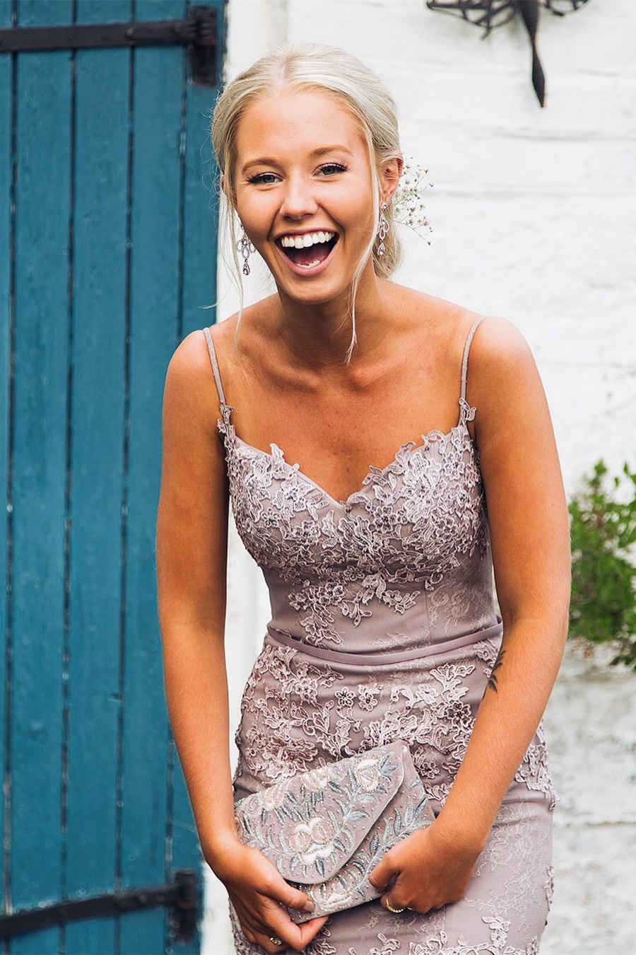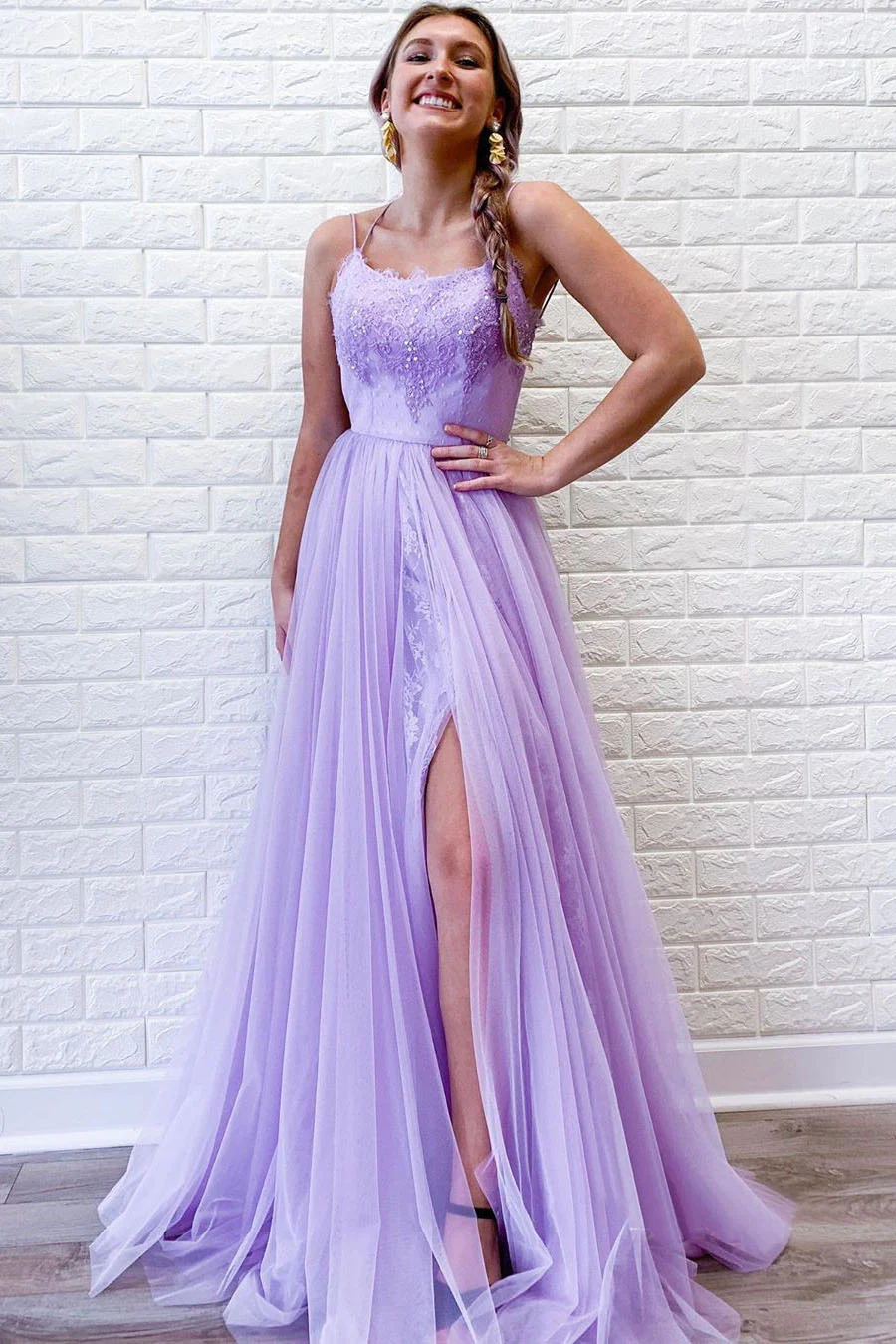 A-Line Lavender Tulle Spaghetti Straps Appliques Long Prom Dress with Slit OK1278