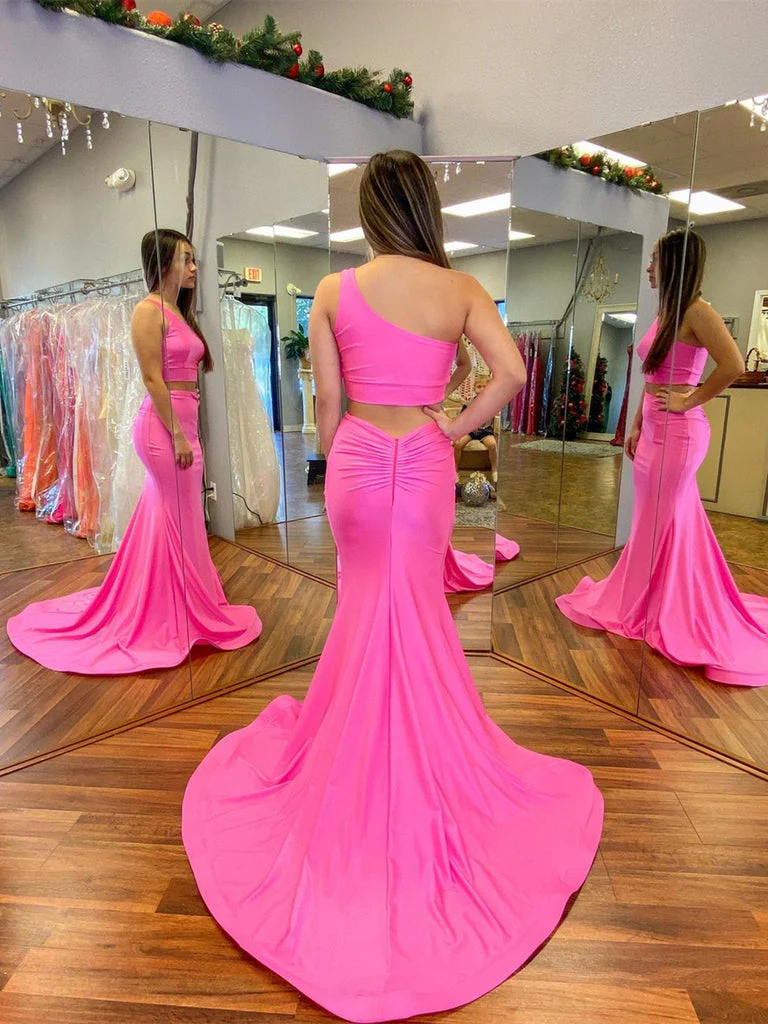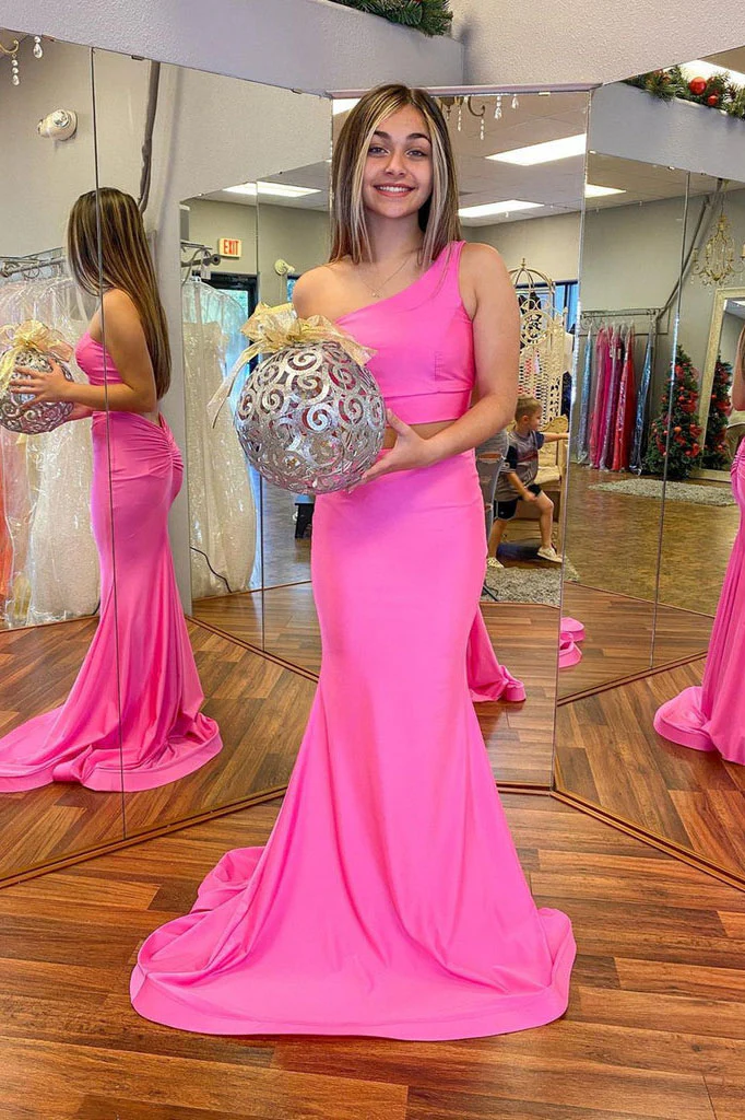 One Shoulder Two Pieces Hot Pink Long Prom Dress Formal Graduation Evening Dress OK1296