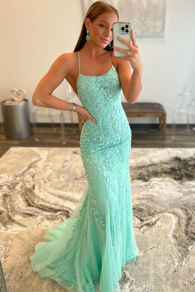Mint Green Lace Appliques Mermaid Backless Long Prom Dress Evening Dress OK1286