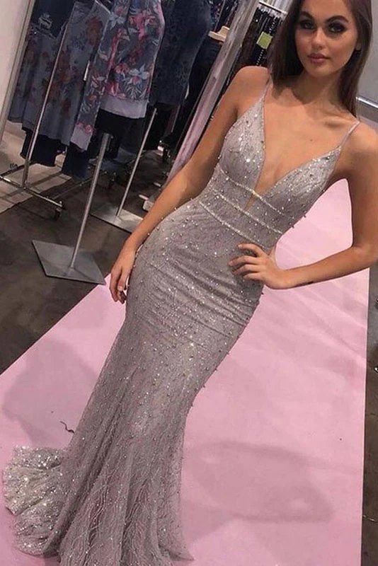 Glamorous Mermaid V Neck Spaghetti Straps Silver Sequins Long Prom Dress Evening Party Dress OK1276
