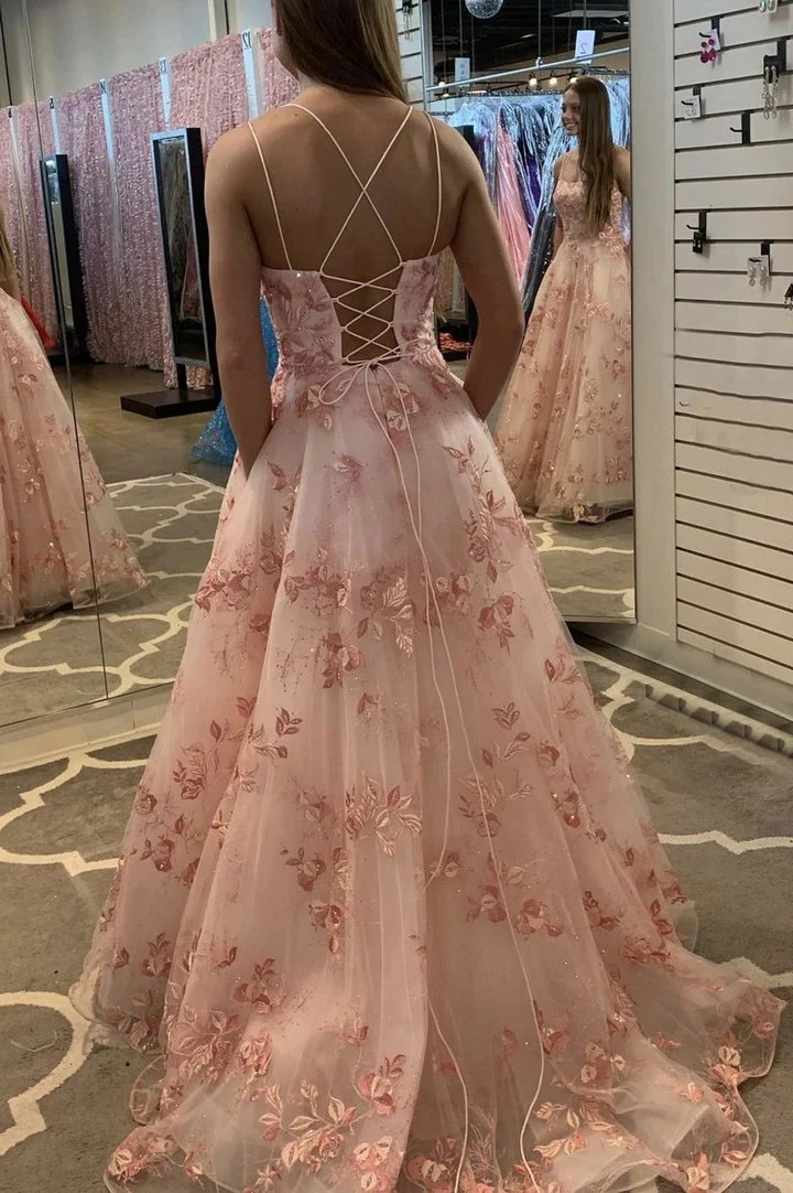 V-neck Pink Lace Appliques Prom Dress with Slit Long Formal Evening Dress OK1314